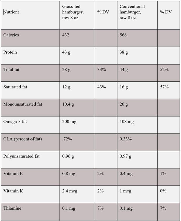 Research results indicate grass-finished beef is significantly higher in favorable fatty acids, key phytonutrients, vitamins and minerals when compared to grain-finished beef. Below is a summary of key nutritional differences between grass-finished beef and grain-finished beef.