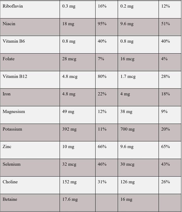 The B Vitamins (B3, B5, B6) are typically 2-3 times higher in grass-finished beef due to the active grazing of growing forages (Duckett et al., 2009; Seck et al., 2017). However, these vitamins can be added to grain-finished rations to raise their levels in the meat. This is not necessary in grass-finished diets. Niacin (a form of Vitamin B3) was nine times higher in the grass-finished beef compared to the grain-finished beef. Niacin promotes a healthy nervous system, digestive system, and skin.