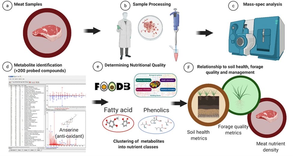 Research performed by Dr. Stephan Van Vliet, Department of Nutrition, Dietetics and Food Sciences, Utah State University, and the Bionutrient Food Association, found that grass-finishing, compared to conventional grain finishing, increases a wide variety of health-promoting compounds in meat and improves animal health. Phytochemical richness of meat is directly related to the finishing diet of animals. The research concludes that grass finishing animals concentrates significantly higher amounts of phytochemicals, including polyphenols, tocopherols, carotenoids (Beef Nutrient Density Project Report, Dec 2021).